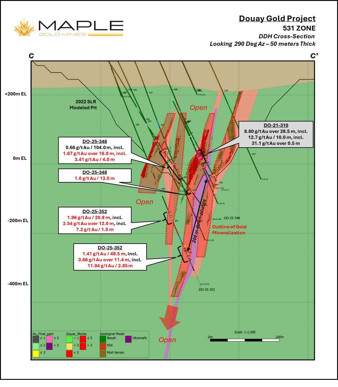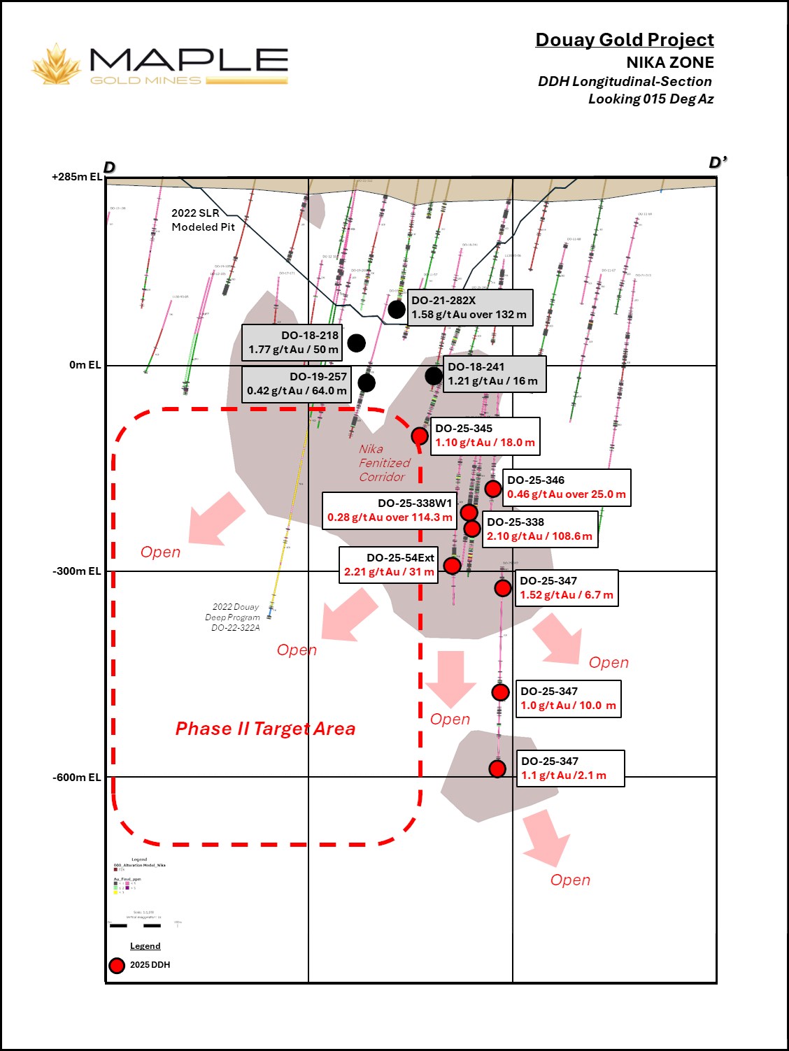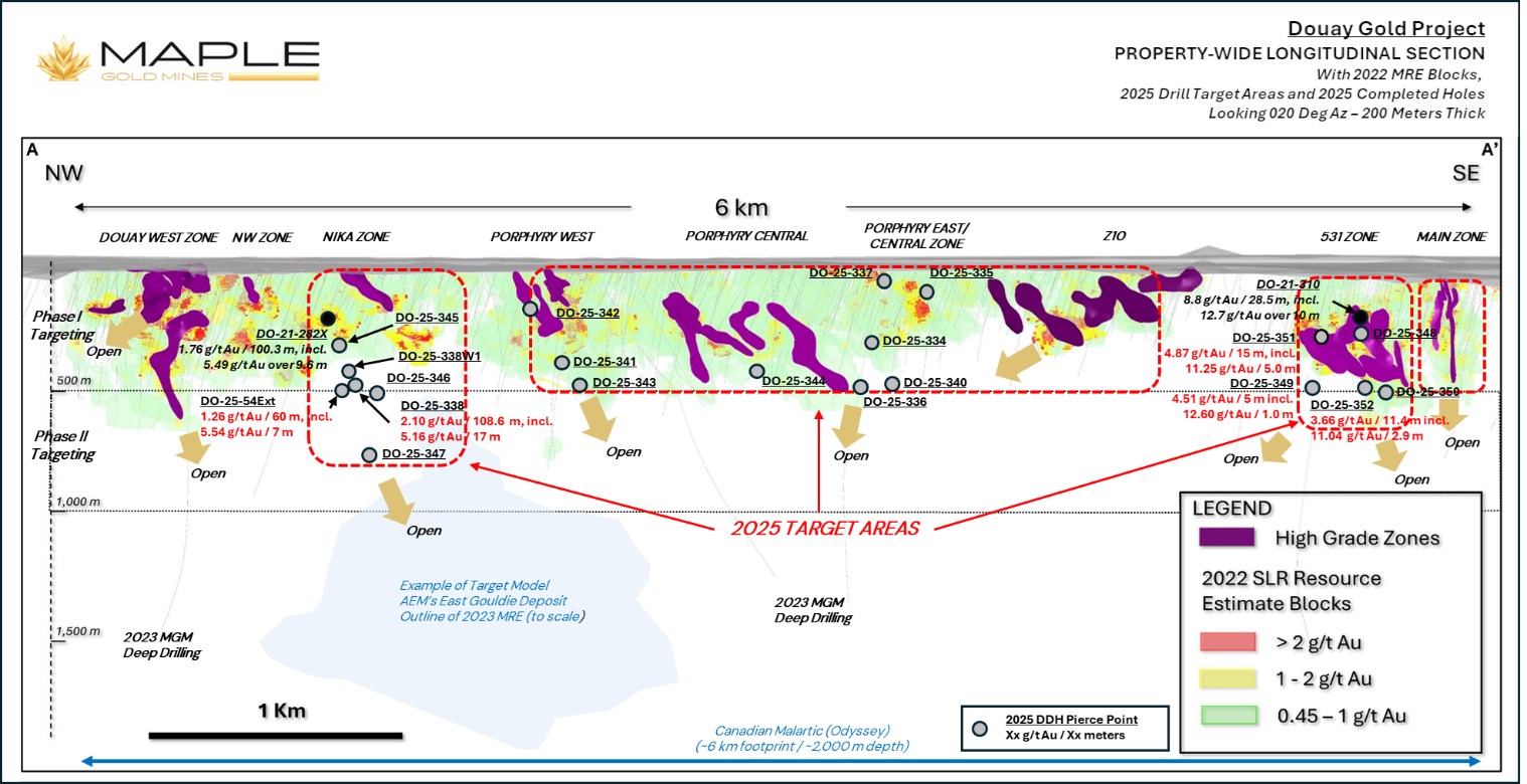 Ian Cunningham-Dunlop, Maple Gold's Vice President, Technical Services, added: "The encouraging 2025 Douay winter drill program results are a testament to hard work and dedication of our revamped exploration team over the past year. We now have a much clearer understanding of the high-grade mineralization controls within the Douay resource area and have shown that gold mineralization and an associated fenite-hematite-albite-pyrite alteration zone extends to significant depths below the current MRE conceptual pit shells with the potential for bulk tonnage underground mineable grades. The Company is planning additional step-out drilling in the 531 Zone and Nika Zone later this year and we are excited about the potential for these zones to deliver additional pit-constrained and underground resources going forward."