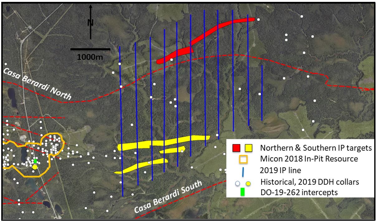 This IP program was designed to test a 4x4km area for the presence of disseminated and/or semi-massive to massive sulfide systems covering part of the eastern extension of the resource area trend, as well as the major lithotectonic break between Cartwright Hills Group basalts to the south and Taibi Group sedimentary rocks to the north, where the Company interprets the northern boundary of the Casa Berardi Deformation Zone to be located.