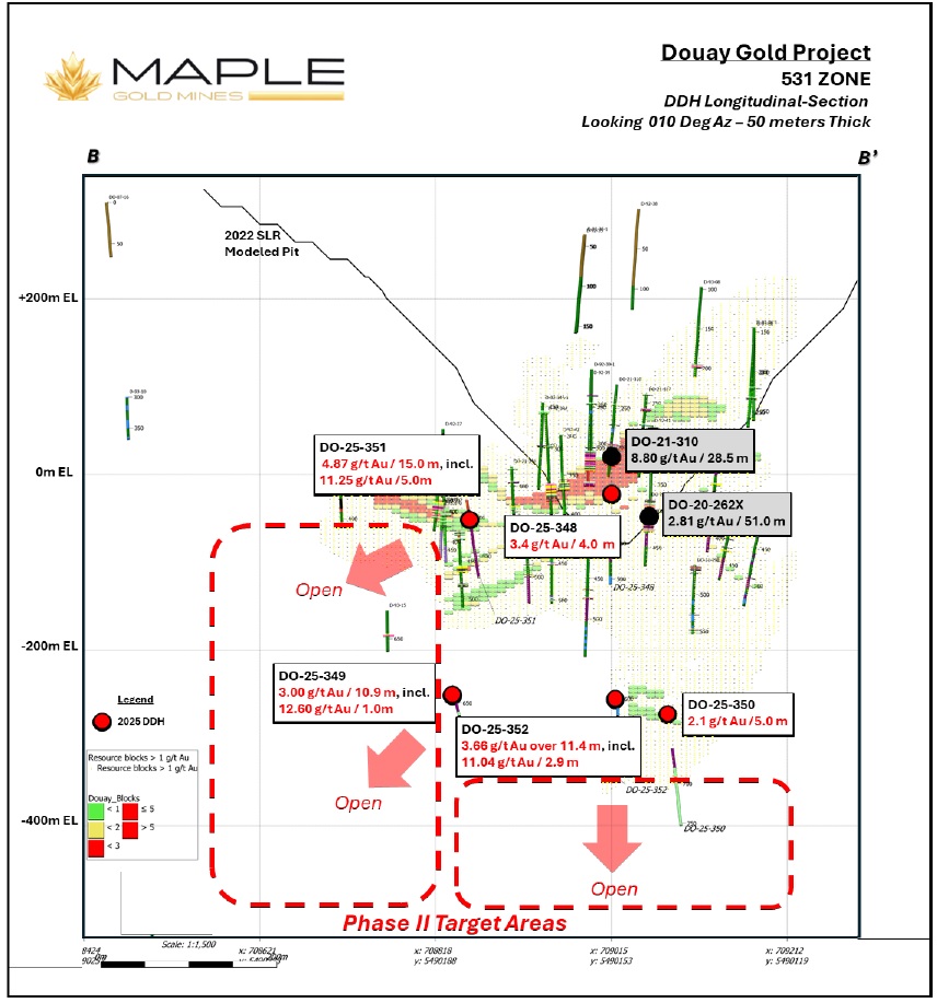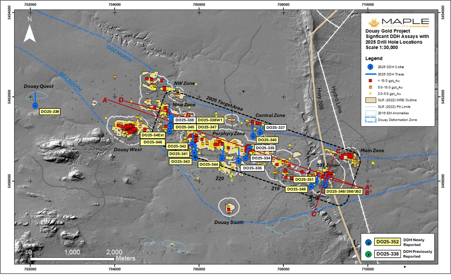 Ian Cunningham-Dunlop, Maple Gold's Vice President, Technical Services, added: "The encouraging 2025 Douay winter drill program results are a testament to hard work and dedication of our revamped exploration team over the past year. We now have a much clearer understanding of the high-grade mineralization controls within the Douay resource area and have shown that gold mineralization and an associated fenite-hematite-albite-pyrite alteration zone extends to significant depths below the current MRE conceptual pit shells with the potential for bulk tonnage underground mineable grades. The Company is planning additional step-out drilling in the 531 Zone and Nika Zone later this year and we are excited about the potential for these zones to deliver additional pit-constrained and underground resources going forward."